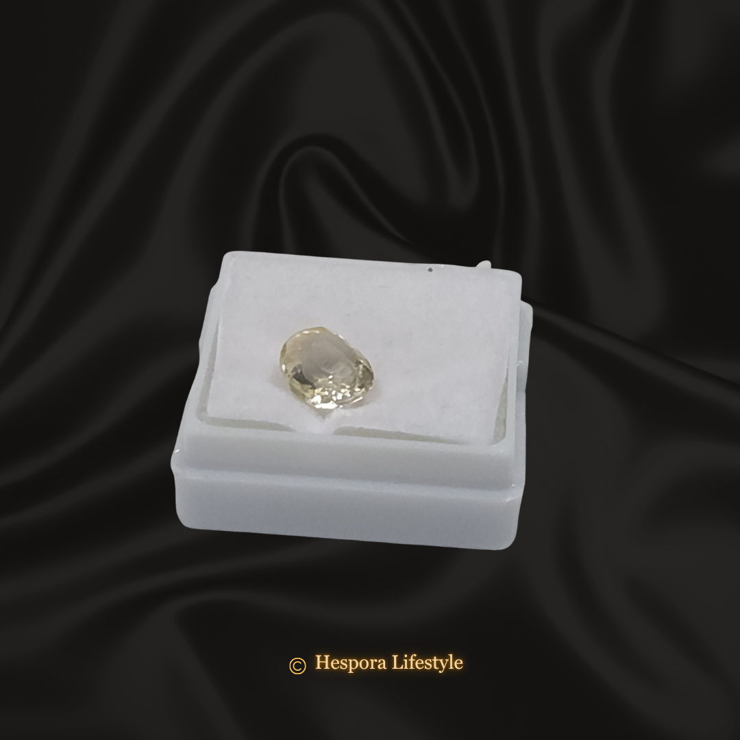 This 2.55-carat Yellow Sapphire radiates a vibrant golden-yellow hue, symbolizing wisdom, prosperity, and planetary grace. Perfectly suited for those seeking astrological benefits of Jupiter (Guru), it is believed to attract abundance, enhance intellect, and improve spiritual growth. Its lively brilliance and medium tone make it an ideal choice for both elegant jewelry and Vedic remedies.